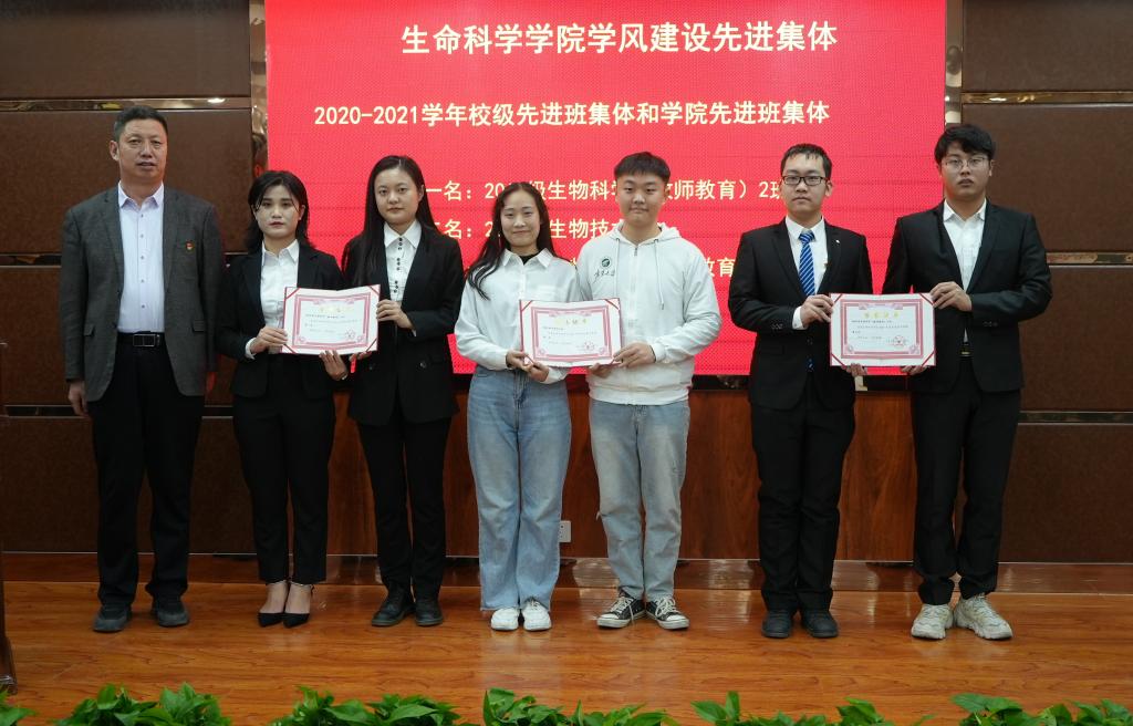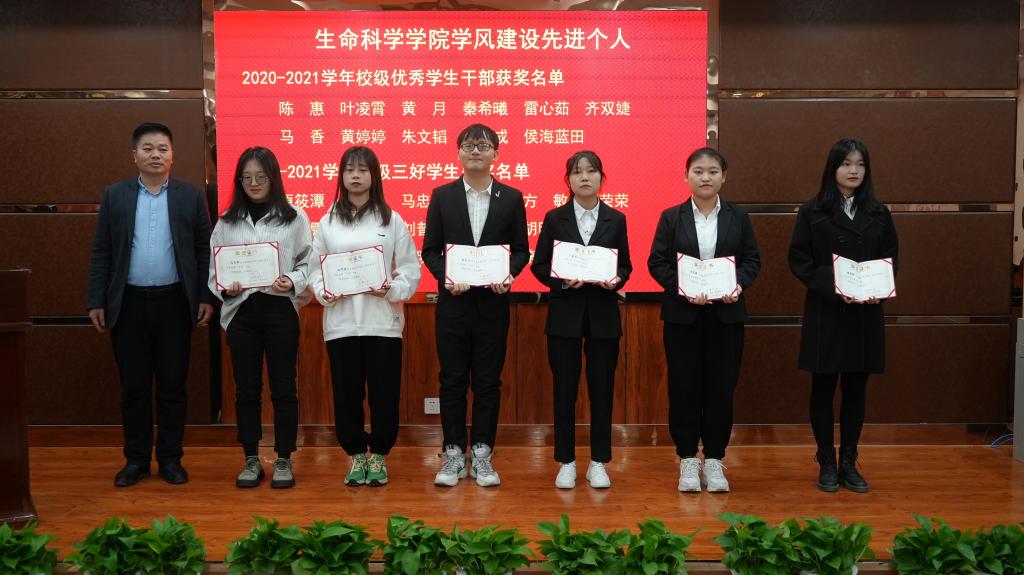 表彰奖励结束后,获奖优秀教师代表微生物与分子生物学系教师高力扬、研究生代表2019级动物学专业硕士研究生王源、校级先进班集体代表2019级生物科学(教师教育)专业2班班长马香、本科生代表2019级生物技术专业班学生雷心茹分别进行交流发言。
