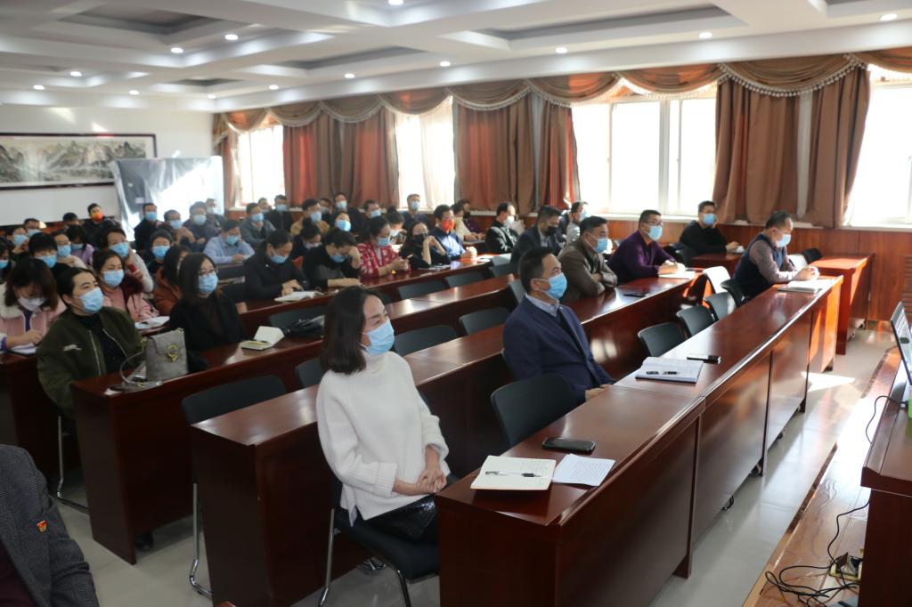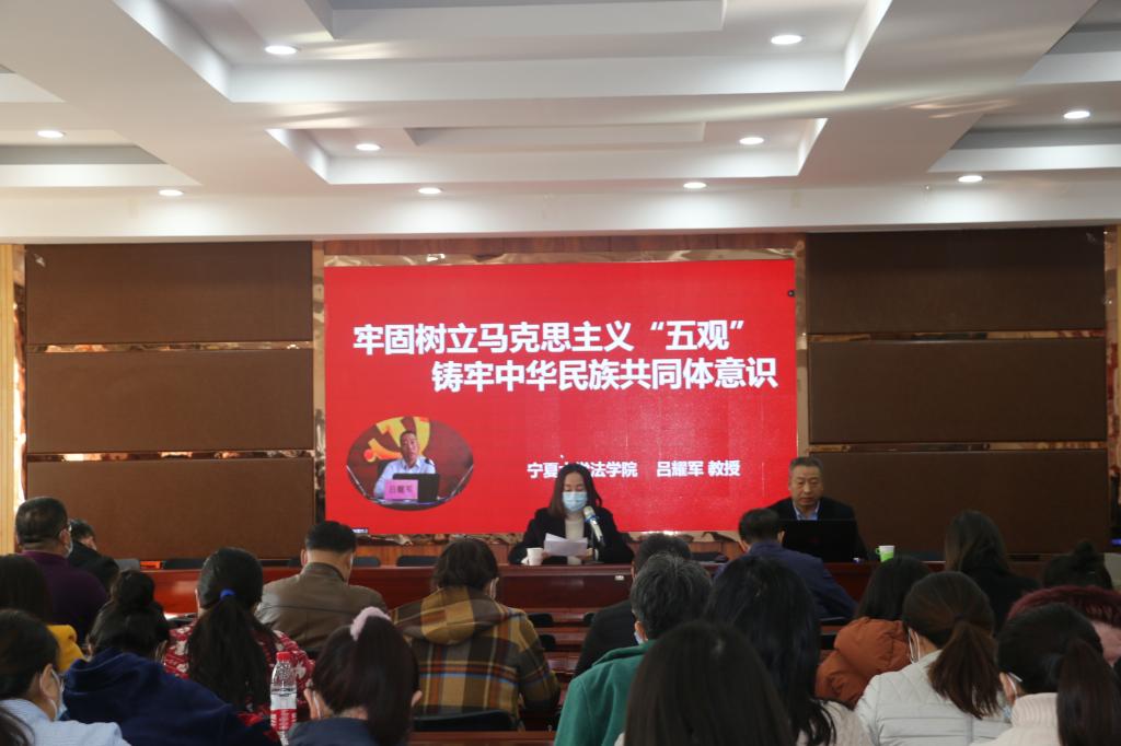 在文萃校区知本楼报告厅举办“牢固树立马克思主义‘五观’,铸牢中华民族共同体意识”民族团结教育宣讲报告会,宁夏大学法学院院长、博士生导师吕耀军教授应邀作专题辅导,报告会由学院党委书记李东宁主持,采用线上线下相结合的方式举行,线下有近300名学生参加。
