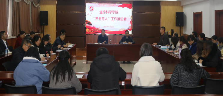在文萃校区知本楼二楼报告厅隆重召开“三全育人”工作推进会,学院党政领导、各办公室、系、教研室主任和研究生导师参加大会,会议由学院党委书记王彦庚主持。