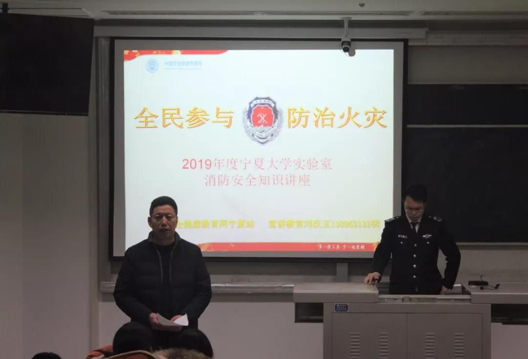在文萃校区一教131教室举办实验室安全教育讲座暨2019年寒假留校学生安全教育大会。安全教育讲座由中国安全健康教育网宁夏站宣讲教官刘汉玉主讲,院党委副书记何彦平主持。