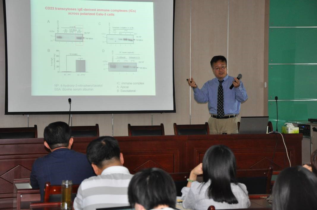 访问期间,朱小平教授作了题为“Translating CD23 immunobiology into the therapeutics and vaccine development”的专题讲座,详细介绍了CD23对免疫反应的影响及其过敏性疾病及哮喘中的作用。朱小平教授还与学院科研骨干进行座谈交流,解决了项目实施过程中的技术难题,并就下一步加强科研合作、人员互访等方面进行了洽谈。