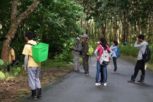 学生分别参加了西双版纳勐仑地区昆虫多样性调查、西双版纳植物园及巴卡小寨大型真菌多样性调查、及古茶山生境及其茶叶品质特点探秘四个小组的实习活动。同学们的工作很辛苦,也非常的有意义。“观鸟组”同学一大早6点钟就进园子了,坐在那里一动也不动用望远镜观察,记录一种采食花蜜的小鸟;“昆虫组”及“两爬组”则是要到晚上十一、二点、观察昆虫传粉的同学则是在中午最热的一、二点钟;“真菌组”同学则要去那些湿漉漉的林下寻找各种各样的蘑菇,晚上还要在解剖镜和显微镜下观察记录;“茶组”同学每天坐车去各个茶园进行探秘。大家很充实的过着每一天,也非常珍惜这样的实习机会。云南大学的指导老师每天和实习同学共同作息,对同学们的工作进行各方面的指导。