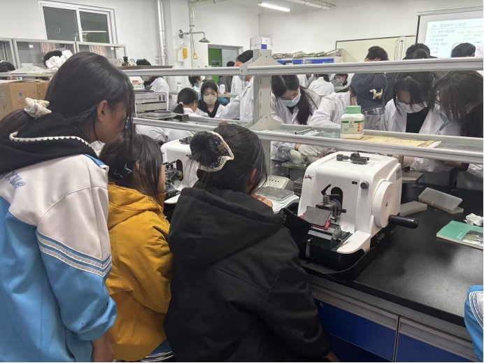 随后,马海军副教授以通俗易懂的语言讲解癌症发生机理,带领学生观察转基因小鼠。学生们通过讲解了解到,借助基因编辑技术,动物模型可精准模拟人类特定癌症的发病过程,为科研人员寻找更有效的治疗靶点提供关键支撑,对生物科研的好奇心与探索欲被充分点燃。