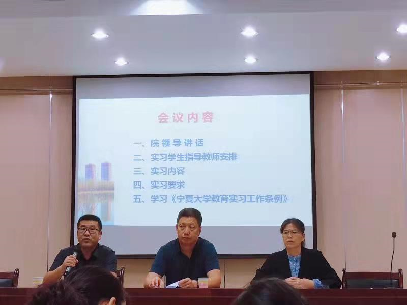 在宁夏大学文萃校区民志楼四楼会议室召开2018级师范生教育实习动员大会。院党委副书记何彦平、副院长王盛、实习指导教师和2018级生物科学(教师教育)专业全体实习生参加会议,会议由师范教育教研室主任周续莲主持。