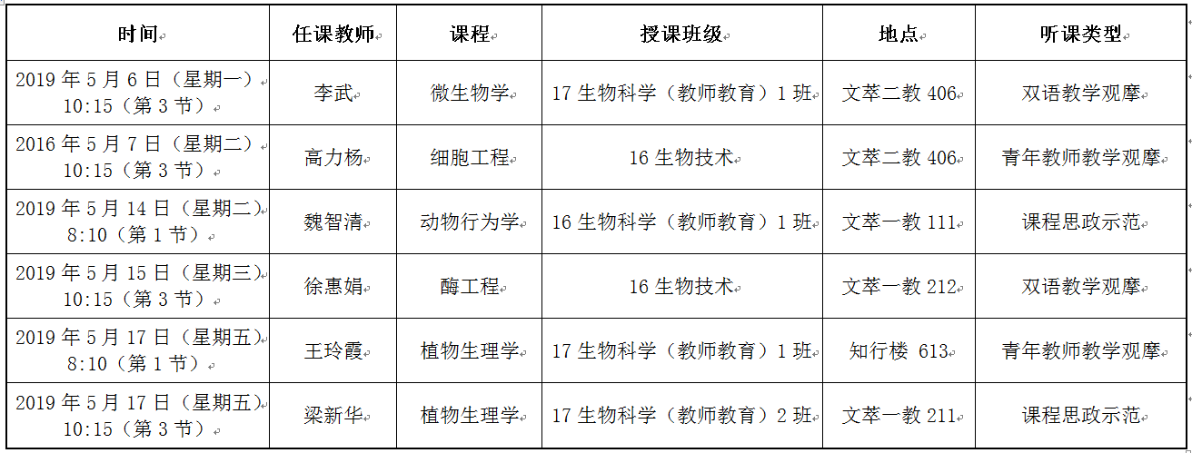 老澳门开奖记录 2018-2019学年第二学期期中教学检查听课安排
