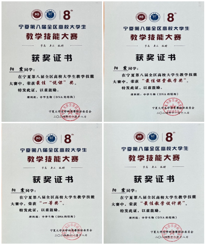2021级生物科学(师范)专业本科生阳震在此次比赛中表现卓越,荣获理科组(中学生物)一等奖,并斩获“最佳教学设计奖”“最佳说课奖”“最佳课堂教学奖”三个单项奖。同时,老澳门六合彩开奖