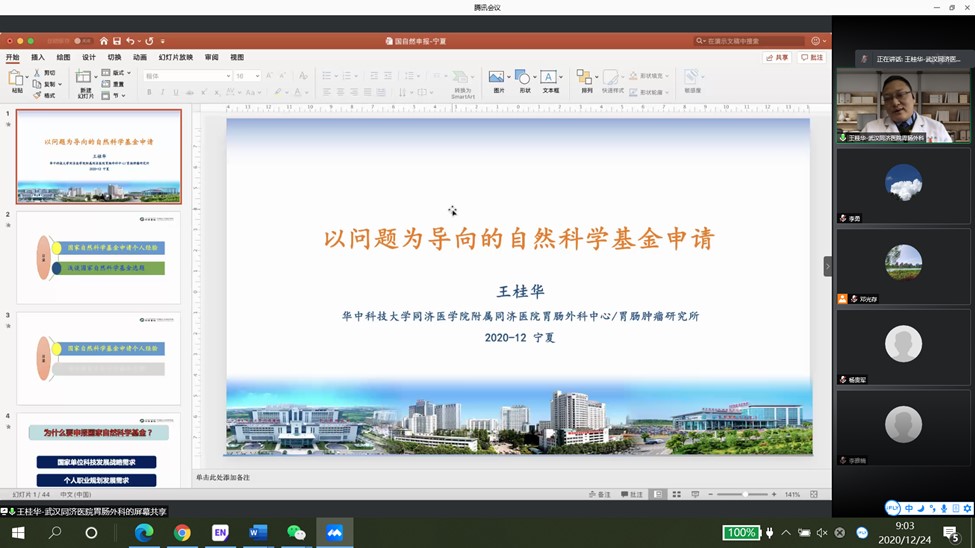 邀请了华中科技大学同济医学院附属同济医院胃肠外科中心医学博士、国家自然科学基金优秀青年基金获得者王桂华教授在线作了“以问题为导向的自然科学基金申请”专题报告会。王桂华教授结合自己的申报和评审经验,从国基金申报的总体策略和具体细节两个层面、从申请人和评审专家两个角度详细讲解了国基金申报中的一些共性问题和个性问题,提出了一些针对性很强的建议,并对老师们提出的问题进行了耐心解答。相信通过本次报告会,对于老澳门六合彩开奖